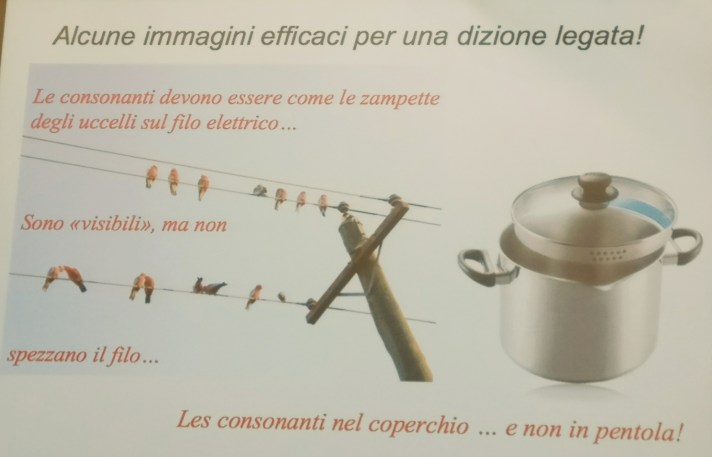 Eh sì..Le consonanti di fatto interrompono il flusso dell’aria fra le vocali.. e la perizia del cantante sta proprio in questo.. legare le vocali nel canto gestendo le consonanti in modo tale che esse non interrompano il flusso dell’aria. Quale idea migliore quindi quella di vedere le vocali come un lungo filo elettrico e le consonanti come “piccole zampette di uccellino su filo lungo”!